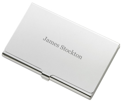 Elegant silver-plated business card case comes with a black velvet carrying sleeve. Engravable for full names or monogram initials. Personalize with up to two lines of engraved text, 15 characters per line.