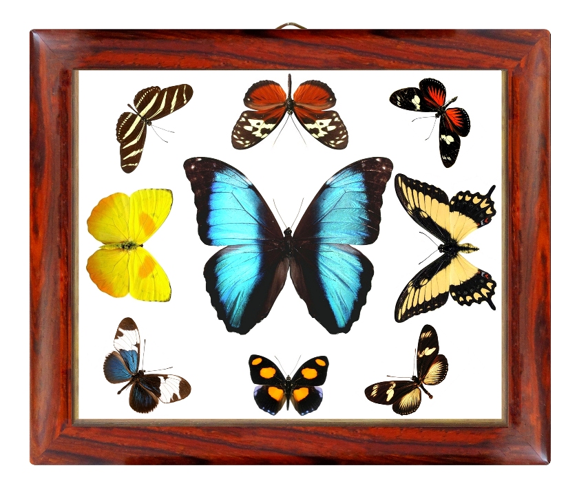 Enjoy the colors of summer tropical butterflies all year round with our beautifully mounted shadow box of humanely harvested specimens. They are displayed between two panes of glass so that both sides of these beautiful creatures can be viewed. Pictured are some of the assorted butterfly varieties you may receive . The wood used in the frame is forest friendly and the butterflies are collected after they have finished their life cycle on butterfly farms. A wonderful accent for your home or as a gift!