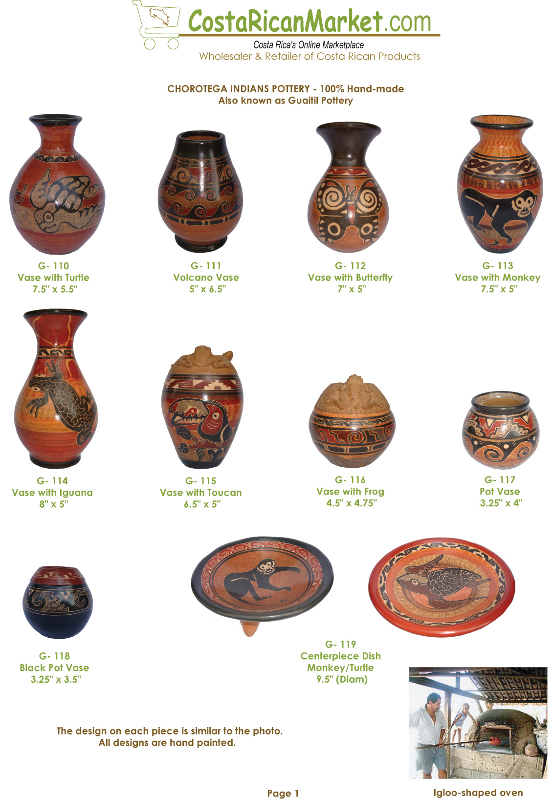 Costa Rican artisans from the Guaitil village fashion their pottery in the tradition of the Chorotega Indians, once an indigenous population that was later absorbed into the Costa Rican culture. All pottery is made completely by hand - no foot pedal or electricity used, only the skill of the potter's hands. Once the item is formed, contrasting clays of either ochre or black are used to wash the outside of the unfired products. Then intricate designs, said to have been power and fertility symbols of the Chorotega Indians, are hand-painted on the surface of each piece. The pottery is then fired in a wood burning, igloo-shaped, earthen kiln that can be seen in each artisan's yard.