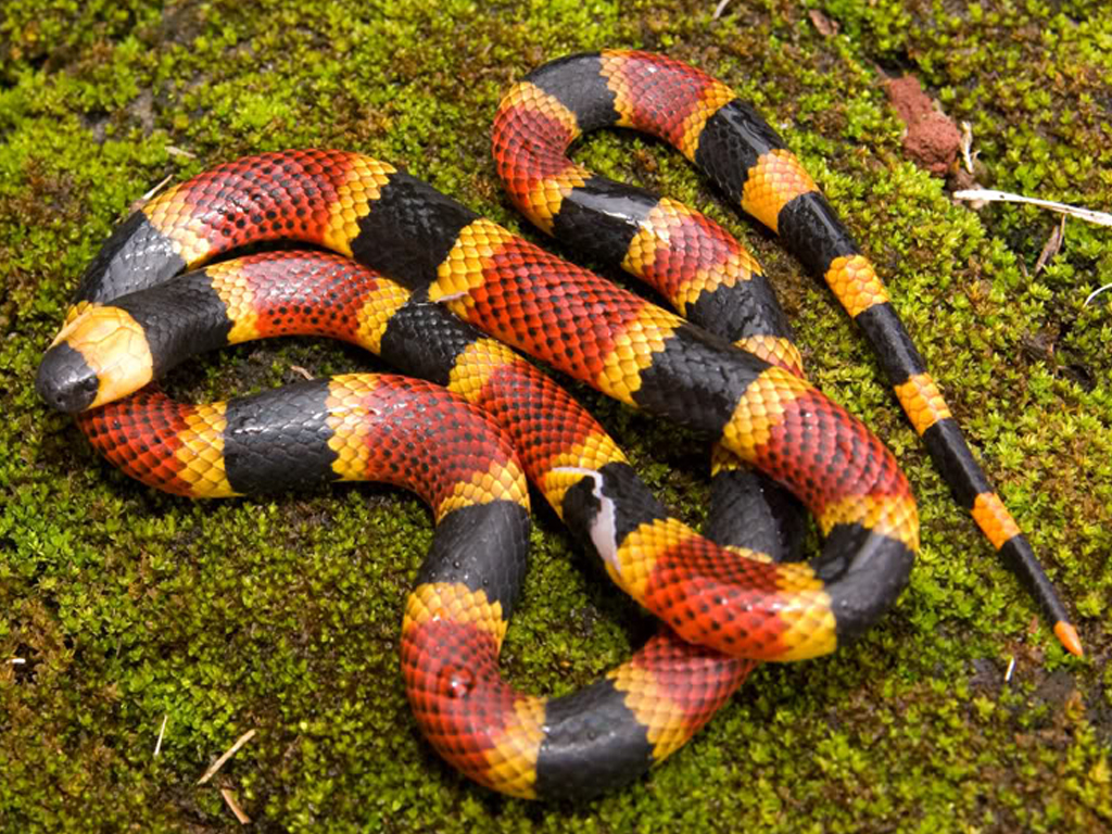 The Coral Snake is most commonly encountered coral snake in Costa Rica. It is distinguished by a pattern of red, yellow, and black body rings with the red rings bordered on both sides by yellow, as well as the bright yellow band across the head.