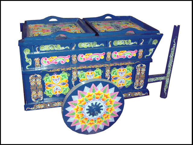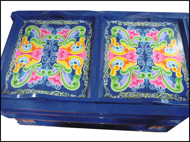 Our artisans have creatively hand-painted this colourful design. Two handy trays are found on the top section of the cart. The inside section has a bottle area and enough space to keep glasses and other bar accessories.