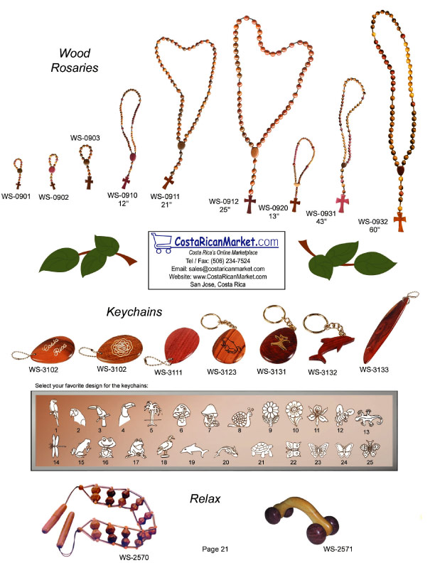 Costa Rica wood rosaries & keychains are made from exotic woods found in our country. We offer a beautiful selection of engravings for the keychains. Also available wood massage articles for a relaxing moment. Handcrafted by talented Costa Rican artisans. Buy wholesale now!