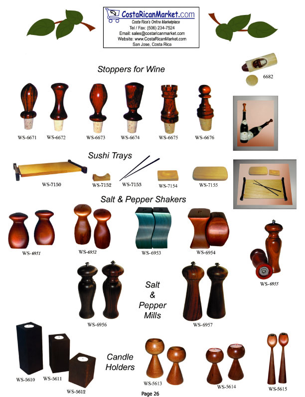 Costa Rica Wood Wine Stoppers, Sushi Trays, Salt & Pepper Shakers / Mills & Candle Holders are great items for any gourmet lover. Sushi accessories are made in reforested timber with an exotic touch on the handles of the trays. A wonderful adquisition for any restaurant. Proudly manufactured by Costa Rican artisans. Buy wholesale now. Click here to go to our Woodcrafts Catalog / Section 1