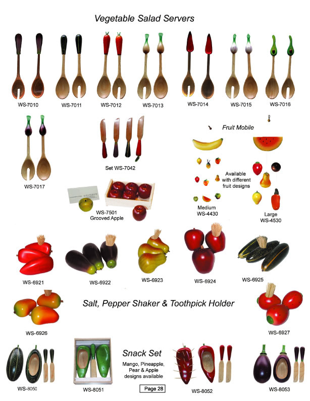Costa Rica Wood Vegetable Salad Servers, Fruit Salt & Pepper Shakers with Toothpick Holders, Fruit Mobiles or Chimes, Fruit Snack Sets & Apple Card Holders