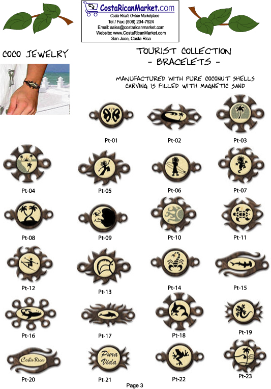 Costa Rica coco jewelry bracelets are made with pure COCONUT SHELLS. Each design is filled with magnetic sand. 100% natural. Enjoy matching necklaces and earrings. Totally hand made by Costa Rican artisans. Surfers and nature lovers will enjoy this jewelry. Buy wholesale now!