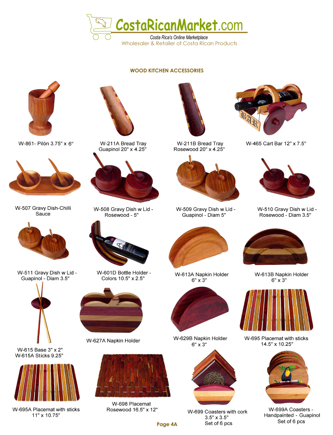 Costa Rica kitchen accessories are made of exotic woods from our country. Enjoy the gravy dishes, napkin holders, wood placemats, wood coasters and more.