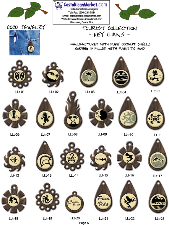 Costa Rica coco jewelry key chains are made with pure COCONUT SHELLS. Each design is filled with magnetic sand. 100% natural. Enjoy matching necklaces, earrings and bracelets. Totally hand made by Costa Rican artisans. Surfers and nature lovers will enjoy this jewelry. Buy wholesale now!