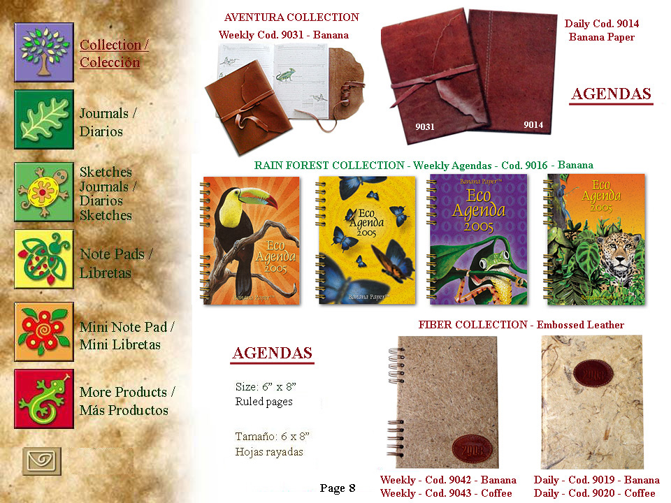Costa Rica banana paper agendas are exotic items to have at the home or office. Many original designs to choose from. Enjoy the Aventura design with leather covering or the Fiber Collection made from 100% banana fiber.