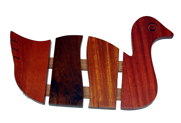 The mixed woods duck trivet displays an extraordinary collection of exotic woods. Each insulator has a unique layout. The artisan combined five different varieties of tropical woods for your enjoyment.