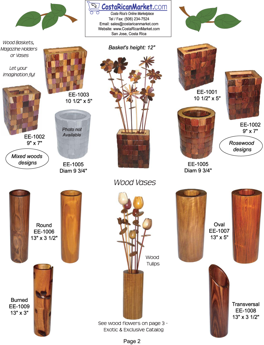 Costa Rica wood Baskets, Magazine Holders & Vases. 100% exotic woods. Office and home decorations. Handcrafted by talented Costa Rican artisans.