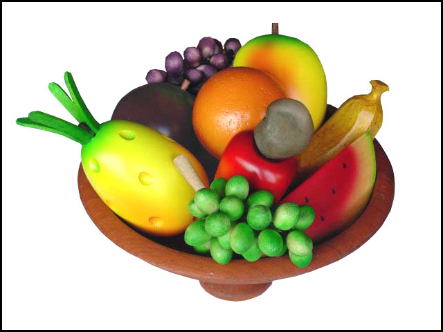 Give color to your home with this tempting set of 9 colorful wooden fruits from the tropics including cashew, banana, pineapple, manga, orange, green grapes, purple grapes, watermelon and carambola.